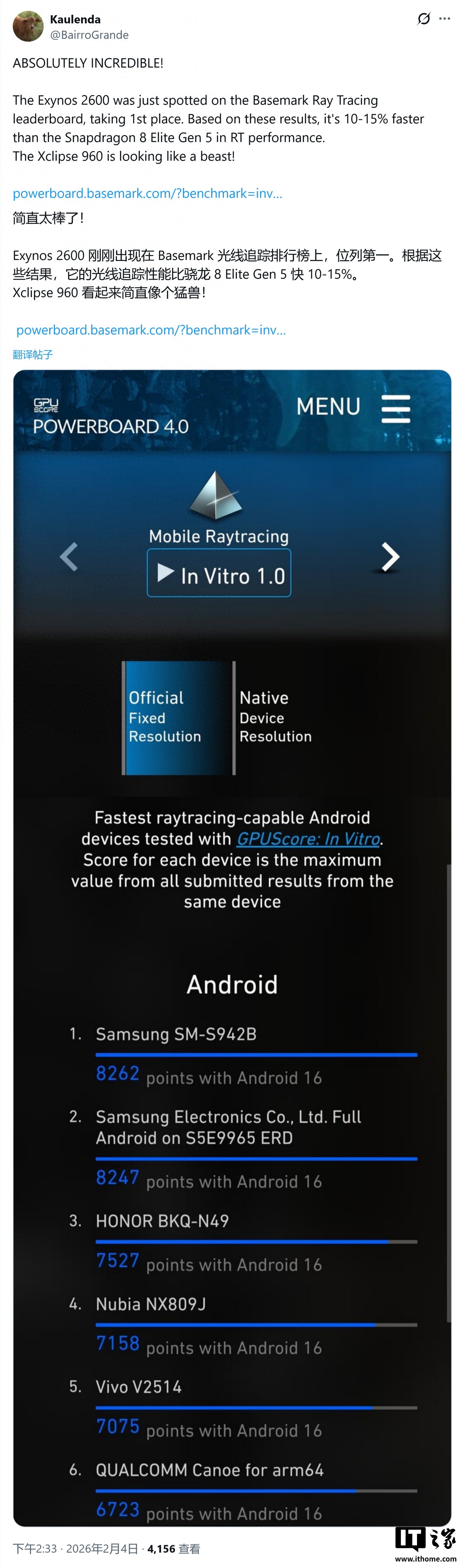 根据 Basemark 光线追踪(Ray Tracing)排行榜的最新数据显示,凭借 Xclipse 960 GPU 的强悍性能,Exynos 2600 已成功击败高通骁龙 8 Elite Gen 5,夺得榜首位置。