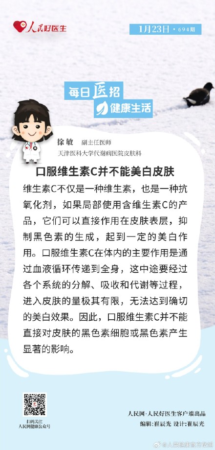 维生素C不仅是一种维生素,也是一种抗氧化剂,如果局部使用含维生素C的产品,它们可以直接作用在皮肤表层,抑制黑色素的生成,起到一定的美白作用。口服维生素C在体内的主要作用是通过血液循环传递到全身,这中途要经过各个系统的分解、吸收和代谢等过程,进入皮肤的量极其有限,无法达到确切的美白效果。因此,口服维生素C并不能直接对皮肤的黑色素细胞或黑色素产生显著的影响。