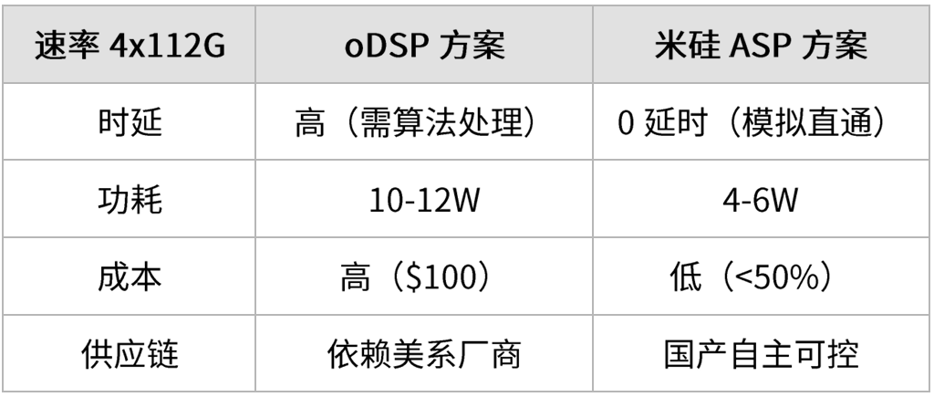 米硅科技全球首发的4×112G ASP (CDR) 电芯片,开辟全新替代路径—直接取代oDSP+Driver+TIA的复杂方案,为光模块厂商提供集成度更高、成本更低、功耗更优的解决方案。其战略意义在于: