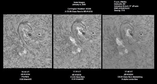 2026年1月8日世界时17时01分,14334号活动区爆发了一次C5.56级耀斑。此次耀斑持续了两个多小时,在达到最大亮度后逐渐减弱。