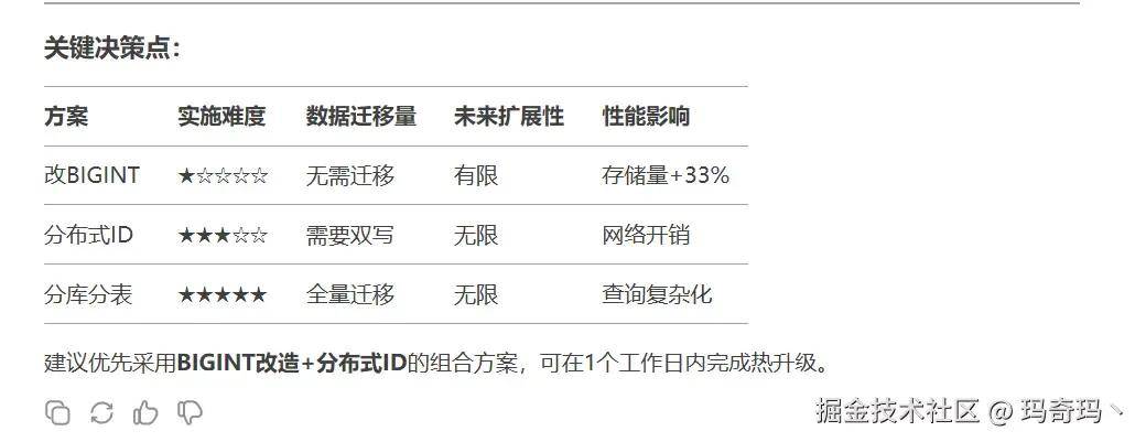 deepseek给我提供了三个方案,第一个是最简单粗暴的改BIGINT,不用迁移数据,但是会全程锁表。第二个分布式ID需要重新设计表,需要把数据迁移到新表,而且还要redis等支撑。第三个分库分表就更麻烦了,分库分表需要引入框架,不按照分片查询还需要引入ES,引入了ES还需要引入同步mysql和ES的中间件logstash等。