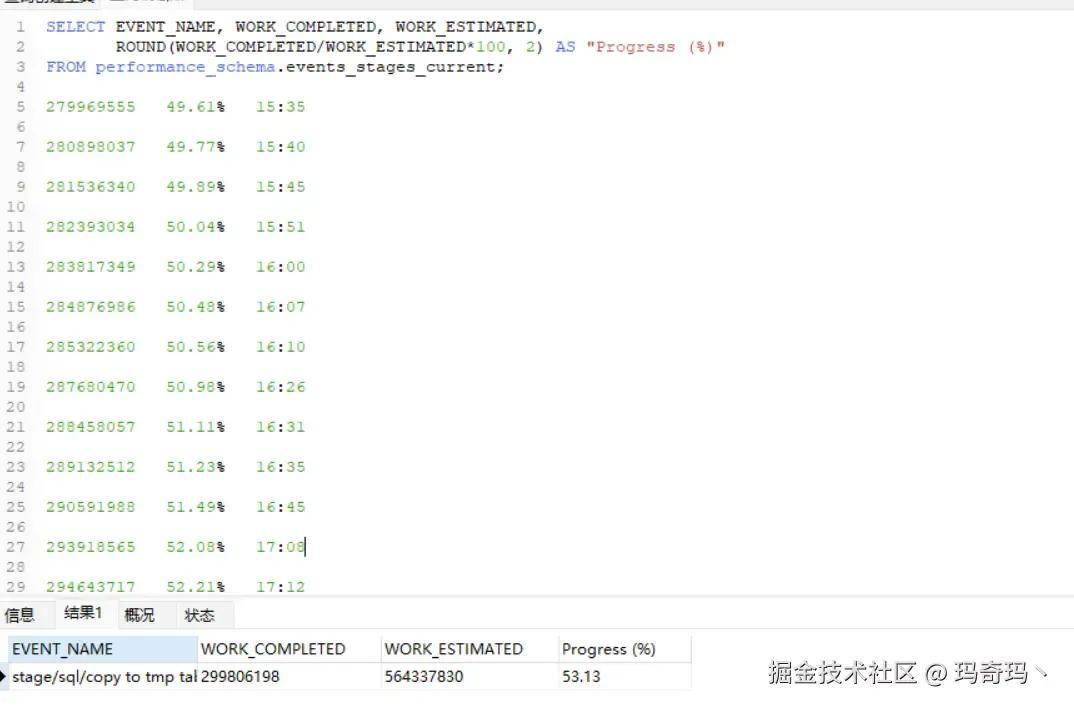 SELECT EVENT_NAME, WORK_COMPLETED, WORK_ESTIMATED, ROUND(WORK_COMPLETED/WORK_ESTIMATED*100, 2) AS "Progress (%)" FROM performance_schema.events_stages_current;