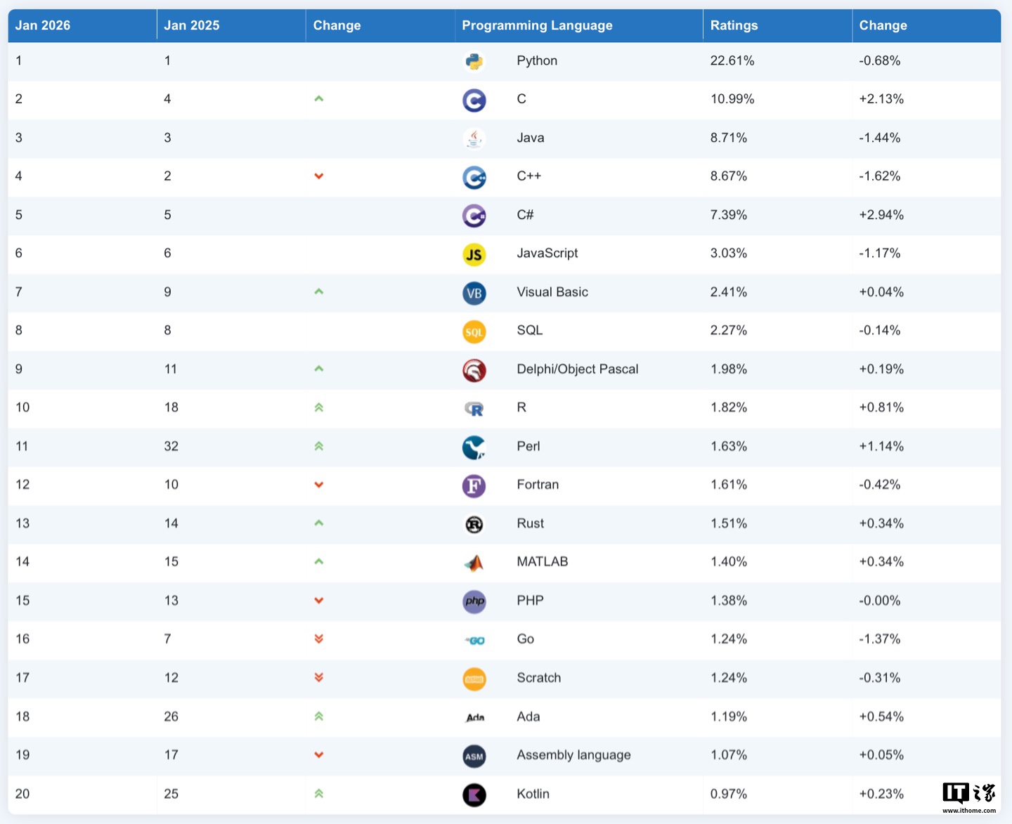 尽管 C++ 近年来以前所未有的速度持续演进,但包括模块化在内的一些较为激进的新特性,至今尚未在工业界得到广泛落地。相比之下,C 语言依然保持着简洁、高效的特点,并且在规模不断扩大的小型嵌入式系统市场中表现出极强的适配性。即便是近年来备受关注的 Rust,也一直难以在这一领域取得突破,虽然它在本月达到了历史最高的第 13 名。