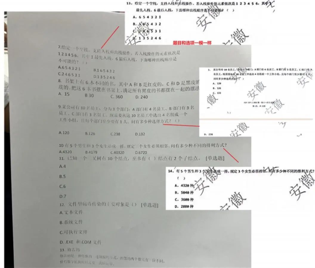 网传的举报信息提到,涉事方是陕西昇腾教育科技有限公司、培训机构“陕西鸿泉”。9月20日,罗某某收到公司领导给的一套模拟试卷,让其务必当日给学生讲解,讲完后收回试卷、草稿纸。罗某某称,当日自己并未在意此事,以为是例行押题,拍了照片。认证考试结束后,罗某某根据考生的描述,发现21日的考卷与20日自己讲解的押题卷,有的考题相似。后来,罗某某将押题卷与考卷对比,发现两份试卷上的部分题目、代码和选项几乎一样,她认为这不是押题能押上的,也不是巧合,其怀疑发生了泄题事件,这对辛苦备考的其他考生不公平。
