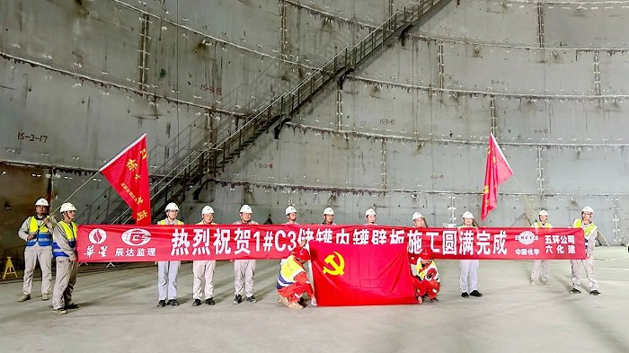 热烈庆祝建党104周年,中国化学所属中国五环工程有限公司以实干担当向党的生日献礼!7月1日,由公司EPC总承包建设的江苏海州湾库区项目(以下简称海州湾项目)再传捷报——1#C3储罐内罐壁板施工圆满完成,为储罐7月底上水开展水压试验奠定坚实基础。