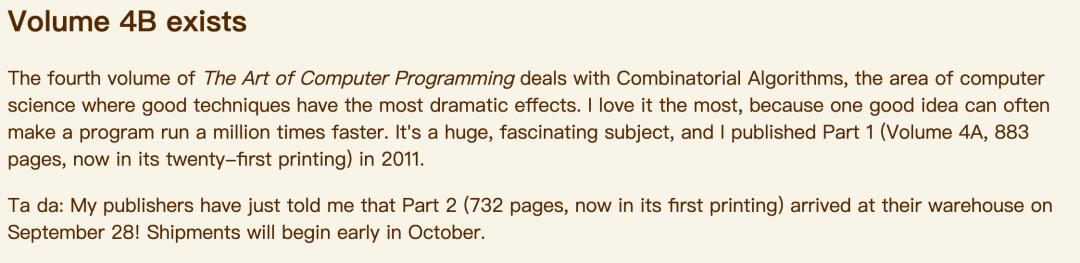 如今,距离上一本《计算机程序设计艺术:卷 4A》出版已经过去了 11 年。这些年间,卷 4A 再版了 21 次,人们却迟迟未等到卷 4B 的正式出版。