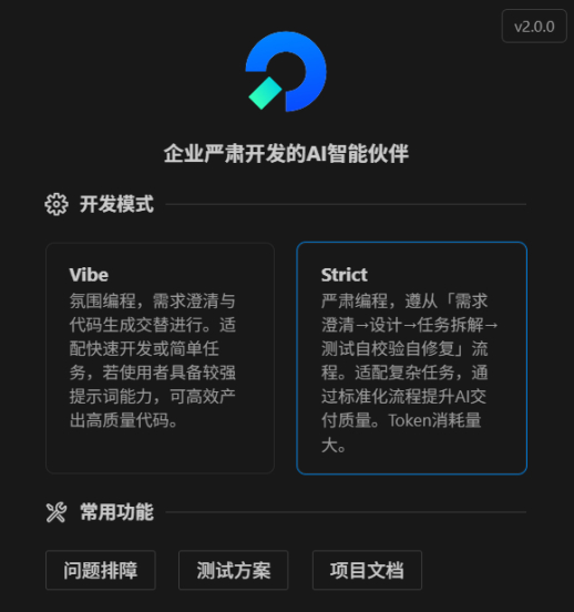 CoStrict 此次引入的 Strict 模式是一种结构化、系统化的开发模式,它严格遵从「项目反推→需求澄清→设计→任务拆解→测试自校验自修复」流程,符合企业开发流程规范,能有效帮助 AI 准确地理解已有项目的依赖关系,复用已有的代码规范,通过标准化流程提升 AI 交付质量,生成可用性更强的代码,特别适用于“老代码加新特性”等复杂任务场景。