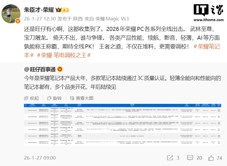 IT之家 1 月 27 日消息,博主 @旺仔百事通 今日表示,今年是荣耀笔记本产品大年,多款笔记本陆续通过 3C 质量认证。轻薄全能向和性能向的笔记本都有,多个品类开花,年后陆续见。