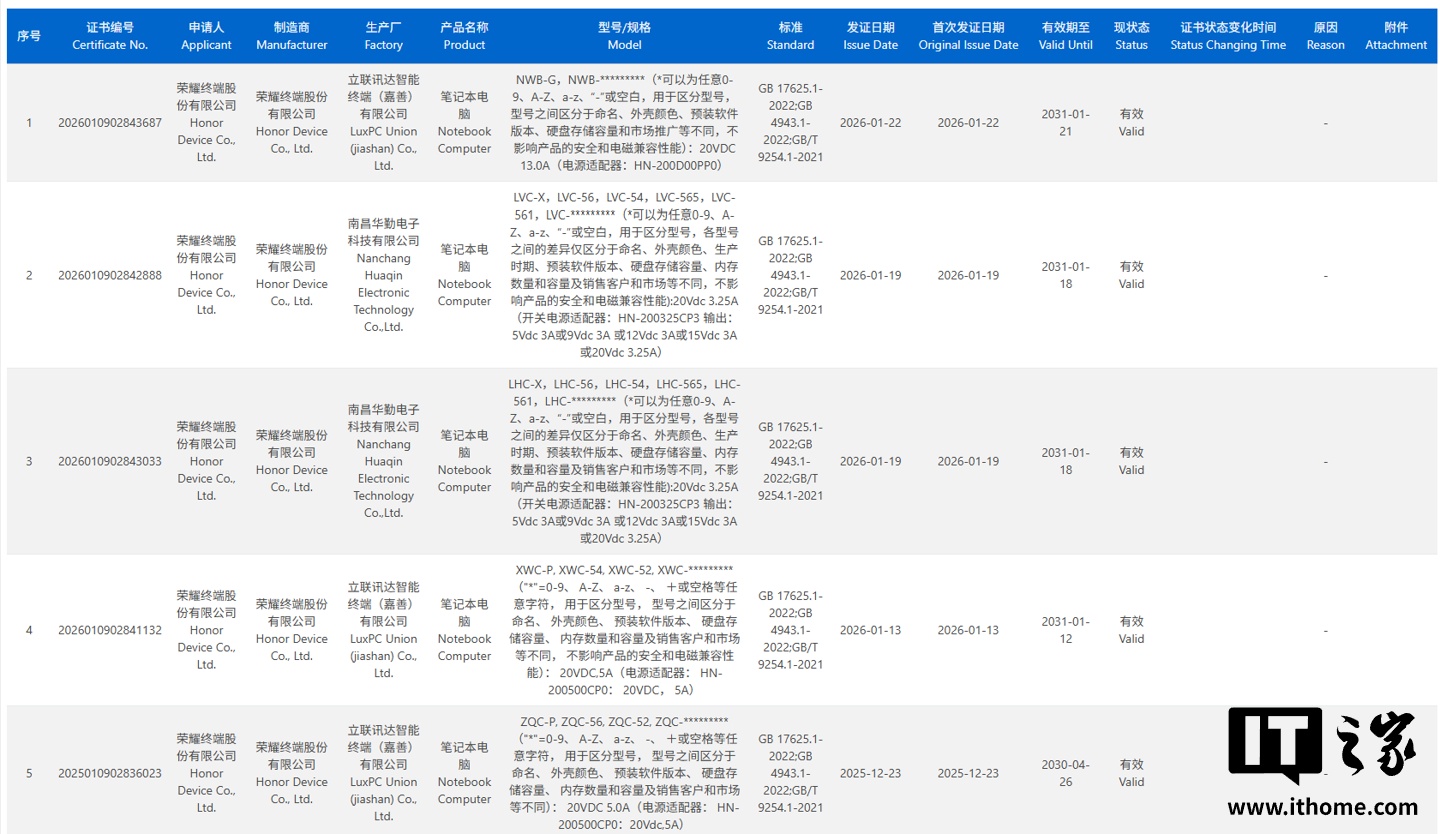 IT之家查询 3C 认证发现,荣耀终端股份有限公司申请的多款笔记本电脑于 2025 年 12 月和 2026 年 1 月通过认证,分别配有 65W、100W、260W 电源适配器。