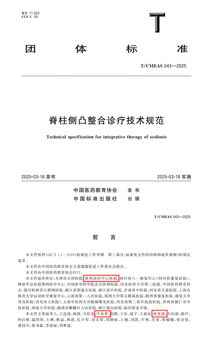 《脊柱侧凸整合诊疗技术规范》由天津市天津医院、胜利油田中心医院等24家医院联合起草,胜利油田中心医院骨科康复科主任牛余贵、主管技师杜良波作为主要起草人牵头制定,经严格审查后由中国医药教育协会发布,并由中国标准出版社出版。作为国内首个集临床评估、治疗分型与个性化方案于一体的脊柱侧凸保守治疗体系,该标准立足国际循证医学方法,以鲜明的技术优势为临床诊疗工作提供了科学、权威的行动指引。