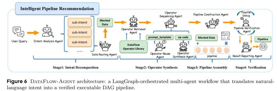 拆解意图 → 检索/合成算子 → 组装 DAG → 沙箱验证 → 输出可执行 pipeline;