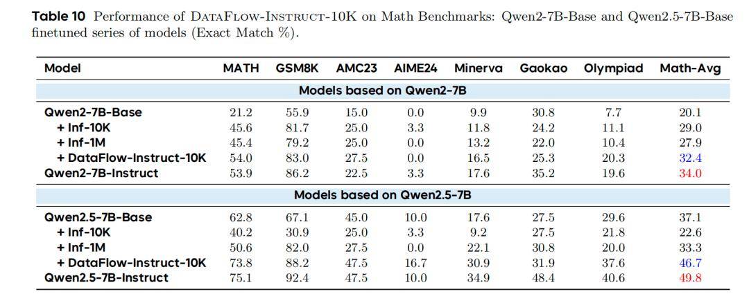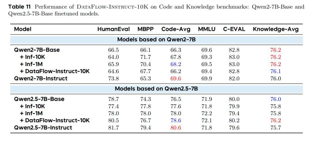使用仅 10K 高质量合成样本(DataFlow-Instruct-10K):表明:小规模、高质量、领域特化的合成数据可媲美大规模通用指令数据。数学:Qwen2.5-7B 得分 46.7,接近 Instruct 模型(49.8),远超 Inf-1M(33.3)代码:Code-Overall 达 78.6,接近 Instruct(80.6),优于 Inf-1M(78.0)通用知识(MMLU/C-Eval):无性能下降,常仅次于 Instruct 模型表明:小规模、高质量、领域特化的合成数据可媲美大规模通用指令数据。数学:Qwen2.5-7B 得分 46.7,接近 Instruct 模型(49.8),远超 Inf-1M(33.3)代码:Code-Overall 达 78.6,接近 Instruct(80.6),优于 Inf-1M(78.0)表明:小规模、高质量、领域特化的合成数据可媲美大规模通用指令数据。