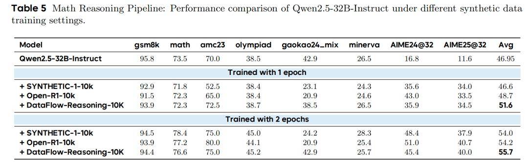 DataFlow-Reasoning-10K 微调 Qwen2.5-32B 后,在8个数学基准上平均得分 55.7,优于 Open-R1(54.2)和 Synthetic-1(54.0)。