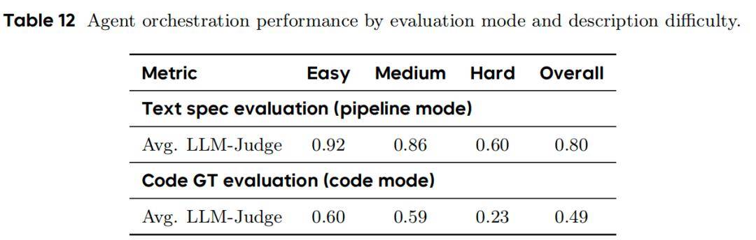 在文本规范对齐(pipeline-level)评估中,LLM-Judge 平均得分 0.80;在代码实现一致性(code-level)评估中,平均得分 0.49;随任务描述模糊度增加(Easy → Hard),性能显著下降(Hard 级 code 得分仅 0.23)。核心结论: