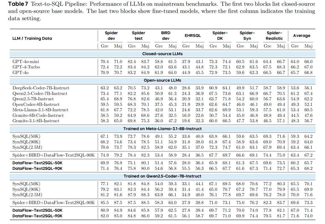 Qwen2.5-Coder-7B 在 DataFlow-Text2SQL-90K 上训练后:Spider-dev 执行准确率从 73.4 → 82.0(+8.6)BIRD-dev 从 50.9 → 59.2(+8.3)EHRSQL 从 24.3 → 56.1(+31.8)DataFlow-Text2SQL-50K 优于 SynSQL-50K;DataFlow-90K 性能接近 SynSQL-2.5M。Spider-dev 执行准确率从 73.4 → 82.0(+8.6)BIRD-dev 从 50.9 → 59.2(+8.3)EHRSQL 从 24.3 → 56.1(+31.8)