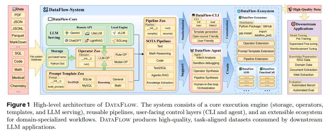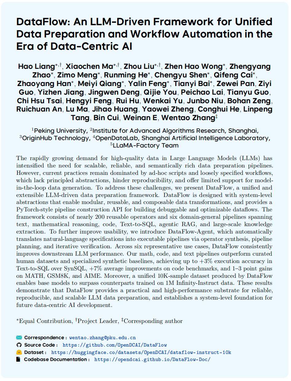 受限于 LLM 数据准备的开放性、多阶段性和对模型在环(model-in-the-loop)的强依赖,目前尚缺乏一个兼具表达力、可扩展性与自动化能力的统一框架。为此,北京大学 DCAI 团队提出了 DataFlow——一个 LLM 驱动的、可编程的数据准备框架,旨在通过近 200 个可复用算子、PyTorch 风格的流水线接口以及自然语言驱动的自动编排机制,系统性解决当前 LLM 数据工程中的碎片化问题,推动高质量训练数据的高效构建与社区共享。