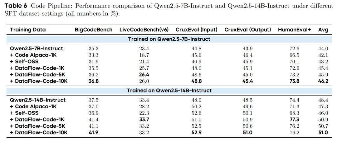 7B模型:DataFlow-Code-10K 平均得分 46.2,优于 Code Alpaca-1K 和 SC2-Exec-Filter-1K。14B模型:DataFlow-Code-10K 平均得分 51.0,LiveCodeBench 从 21.9(Code Alpaca)提升至 33.2。