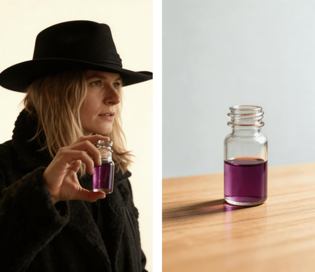 再比如,下面这个视频里有一个戴黑帽穿黑大衣的女人,手里拿着一瓶紫色液体。我们只需给模型一条指令「找到这个人和这瓶东西,删掉」,人和瓶子就能干干净净消失,背景无缝填补。