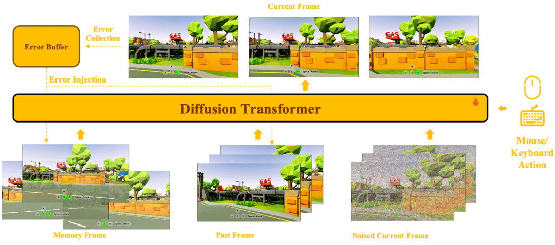 长时序生成中模型会逐渐偏离真实状态,3.0在训练时就显式建模生成结果与真实帧之间的误差,并把误差作为条件重新注入,让模型大量接触「已经跑偏」的状态,逼它学会自我纠正。