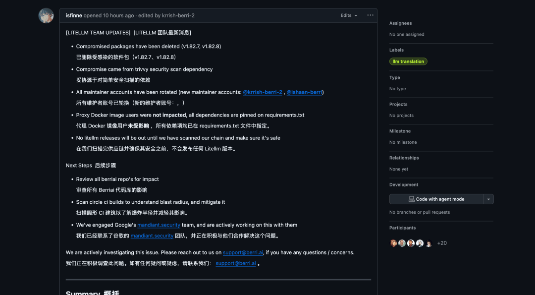 目前受影响的版本已经被撤回,PyPI也已解除对LiteLLM的隔离,代理者目前正在处理后续事宜,预计将审查所有Berriai代码库的影响,以及整体扫描CI情况并减轻其作用。