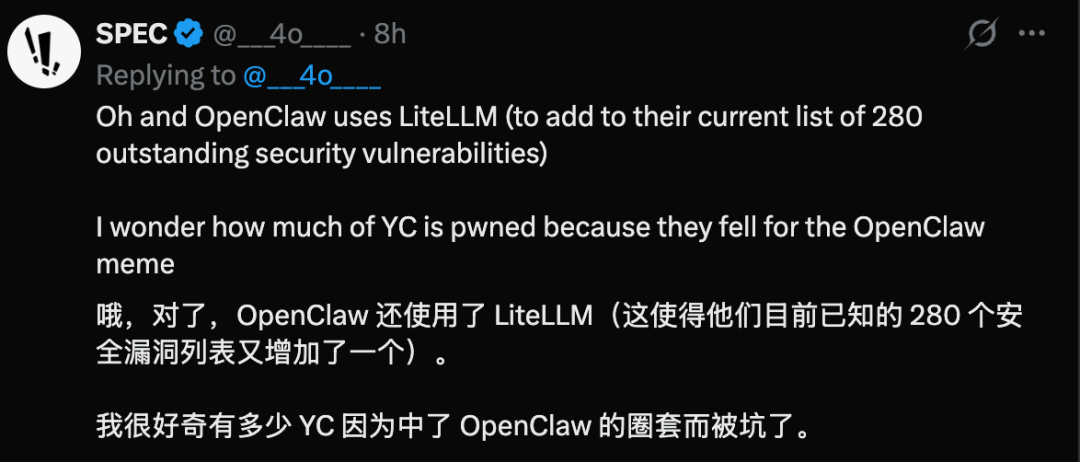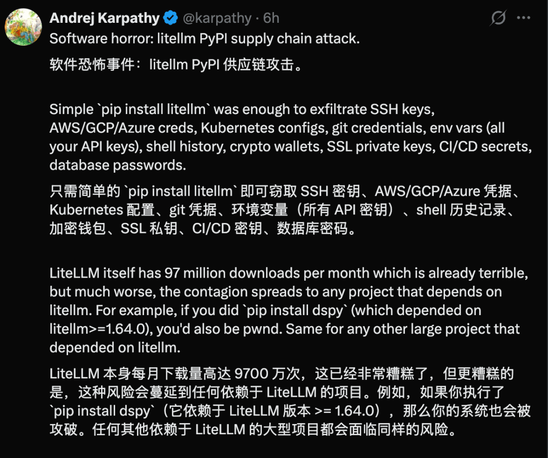 社区迅速引起热议,卡帕西也出面提醒,让程序员小心LiteLLM供应链攻击。