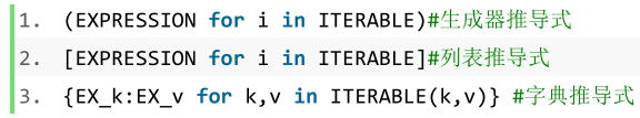 上面说了列表推导式,也提到了字典推导式,其实一共有三种形式类似的推导式,分别是: