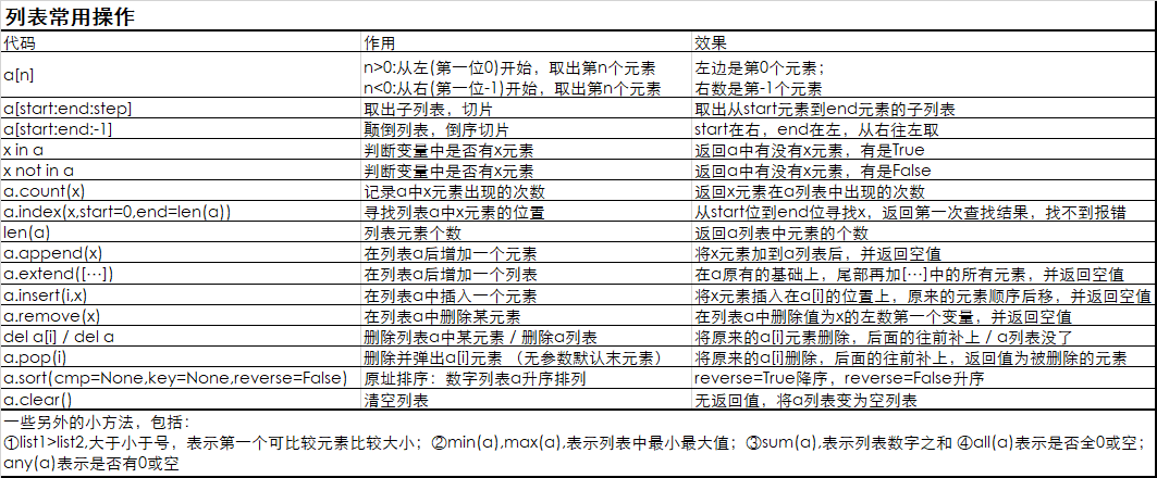 列表是一个序列,特点是有序、可以修改;用一对中括号囊括序列的元素,用逗号进行元素间的分隔,各元素类型可以相同,也可以不相同。下面列举一些常用的操作: