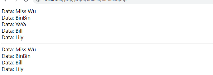 <html><head><title>linktlist</title></head><body><?phpclass Node{public $data=;public $next=null;public function __construct($data,$next){$this->data=$data;$this->next=$next;}}$head=new Node("Miss Wu",null);function add($adata,$head){$a=new Node($adata,null);$a->next = $head->next;$head->next = $a;}function display($head){$p=$head;while($p!=null){echo "Data: ".$p->data."<br/>";$p=$p->next;}}function del($data,$head){$p= $head;$pre=null;while($p){if(strcmp($p->data,$data)==0){$pre->next=$p->next;}$pre=$p;$p=$p->next;}}add("Lily",$head);add("Bill",$head);add("YaYa",$head);add("BinBin",$head);display($head);echo "<hr/>";del("YaYa",$head);display($head);?></body></html>