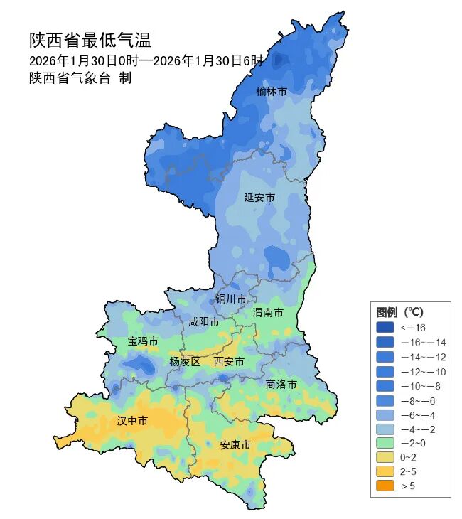 关中-13~2℃,最低长安光头山站-12.8℃,西安站0.9℃;