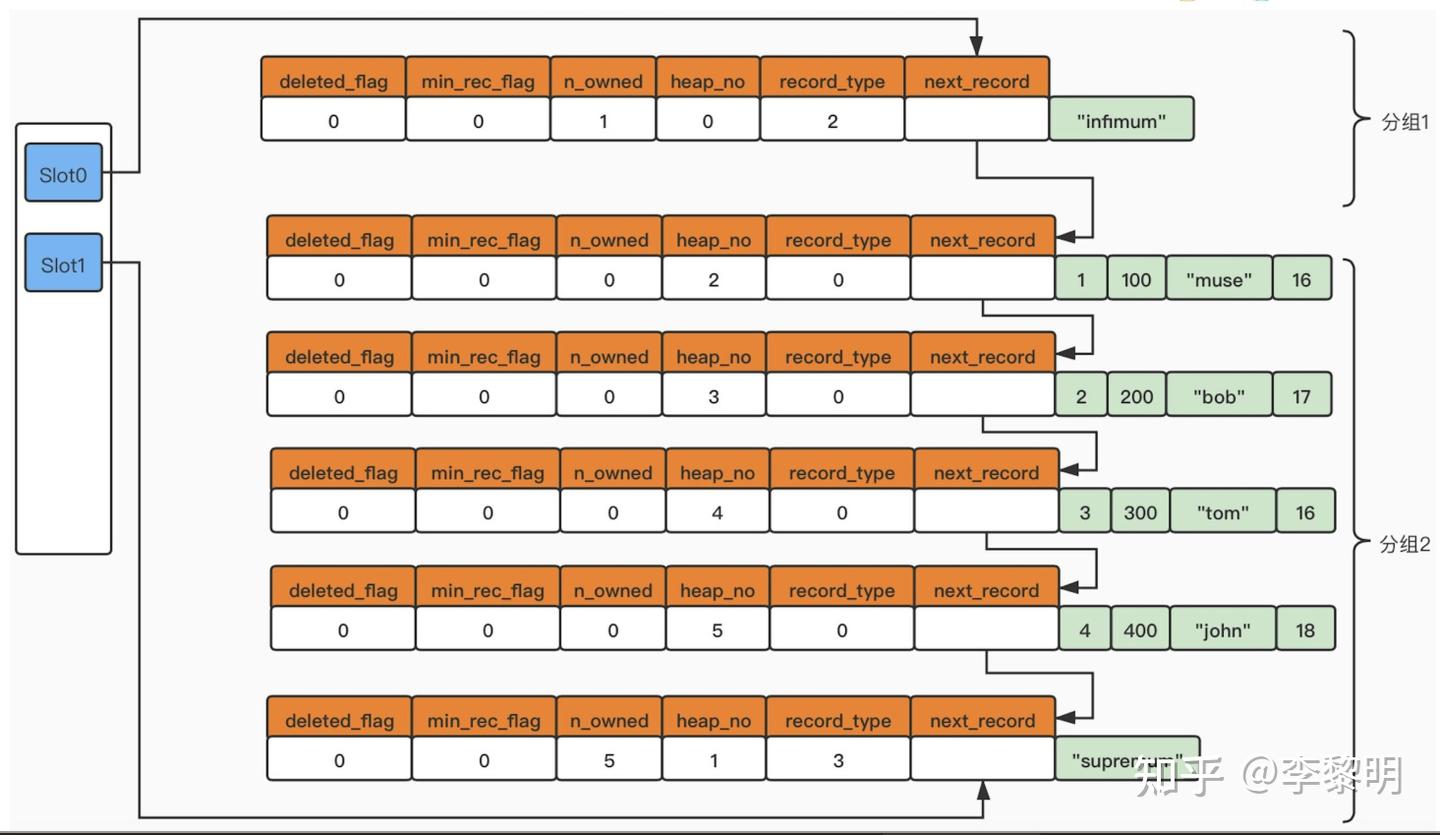 记录头信息字段含义deleted_flag物理删除的标志(1:已经删除;0:未删除)min_rec_flagB+树每层非一字节点中标识最小的目录项记录n_owned把一个页划分各n个组,每个组里面的大哥会保存该值,该值表示一个组里面有多少条记录heap_no堆号,每条插入的记录都会分配堆号,默认heap_no=2开始,infimum的heap_no=0,Suprenum的heap_no=1record_type记录类型(0:普通插入的记录;1:B+树非叶子节点目录项记录;2:表示infimum的记录;3:表示Supremum的记录)next_record下一条记录(表示从当前记录的真实数据到下一条记录的真实数据的距离)记录头信息里面有一个next_record的字段,这个字段指向下一个记录的记录头信息,形成Page Directory的结构,如下图所示: