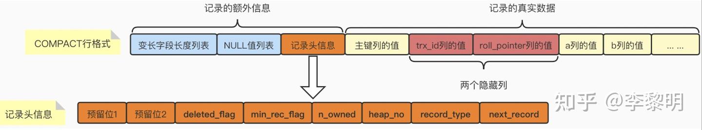 一条记录分为记录的额外信息和记录的真实数据两部分,记录的额外信息里面比较重要的就是记录头信息,记录的真实数据就是我们在表中插入的实际数据。