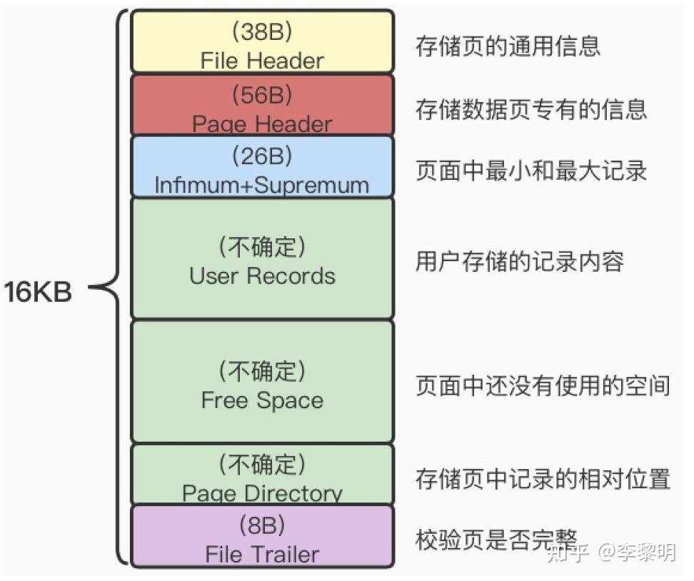 一个页大小一般是16KB,这16KB的空间在逻辑上可以分成7个部分,这七个部分所保存的数据在图上都有展示,详细解释,可以阅读这篇文章。