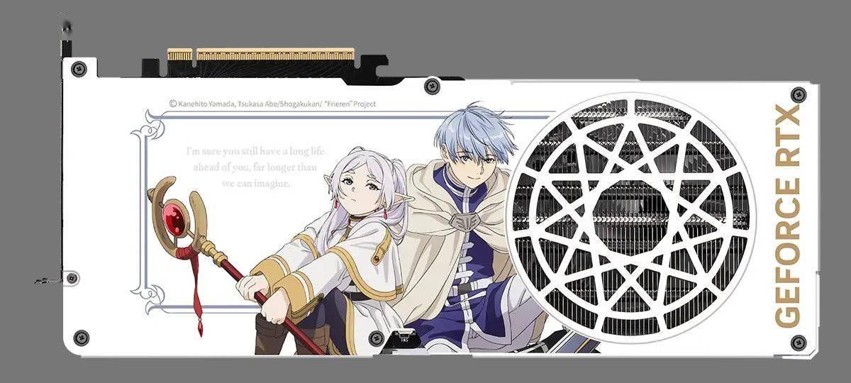 其中 GeForce RTX 5070 Ti 16G FRIEREN EDITION OC 基于微星经典 GAMING TRIO 魔龙系列模具打造,背板不仅具备魔法阵格栅通风开孔,还以温感变色油墨写有角色辛美尔的标志性台词"Im sure you still have a long life ahead of you, far longer than we can imagine."。