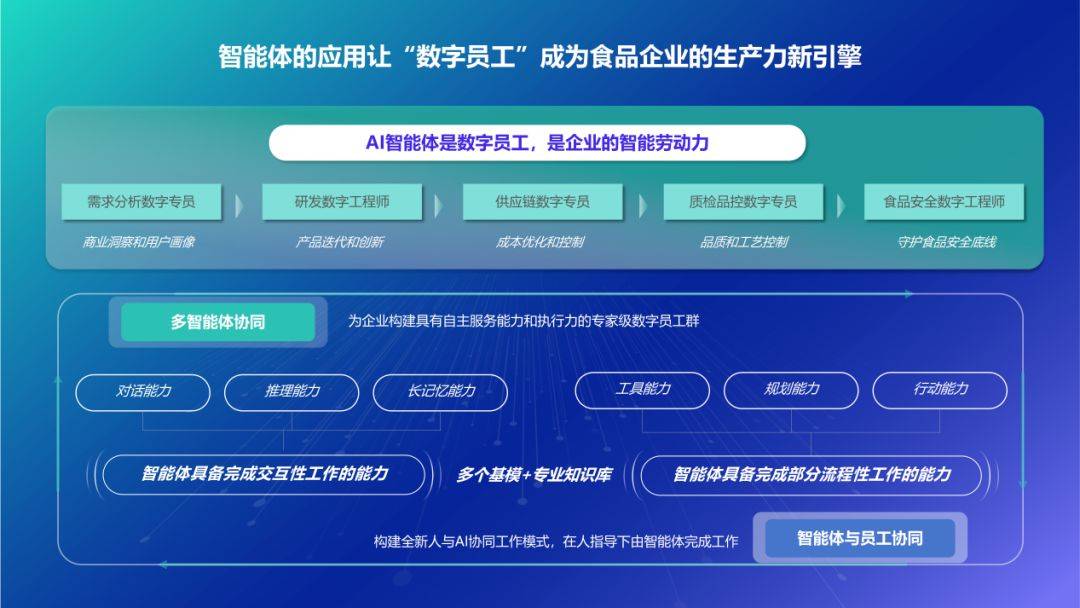 基于在食品行业的多年积累,新腾数致自主研发了一款面向食品企业的智能体产品。该智能体具备两大核心能力:一是能够独立完成多数交互性工作;二是可在专家指导下胜任部分流程性任务。