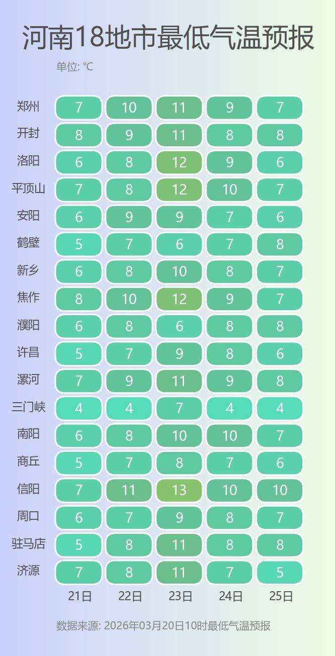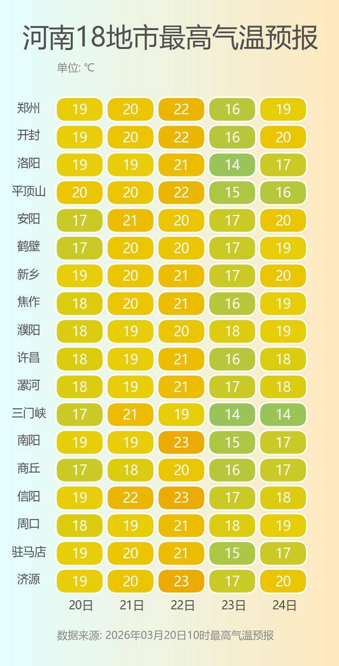 阳光相伴,气温也将继续回升,加上 明天(周六)白天偏南暖风的助力( 西部、北部部分县市阵风6-7级), 本周末河南大部的 最高气温将纷纷越过20℃线,暖暖的春意将迎面扑来。不过, 下周一随着弱冷空气和雨水的到访,回暖的进程将被暂时打断,大部地区的最高气温会 回落至15℃出头。短暂调整过后,预计 下周二开始,升温继续~相比之下, 未来五天大部地区的 最低气温则会继续在5~10℃之间波动,早晚凉意明显,记得多穿一件外套。