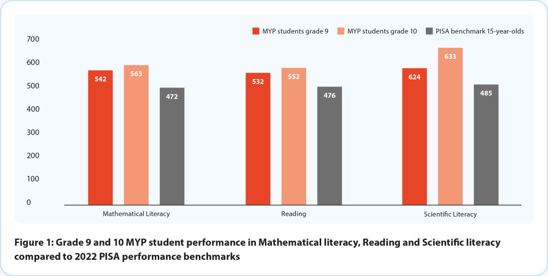 九、十年级的MYP学生在所有领域的得分均显著高于2022年PISA平均水平。