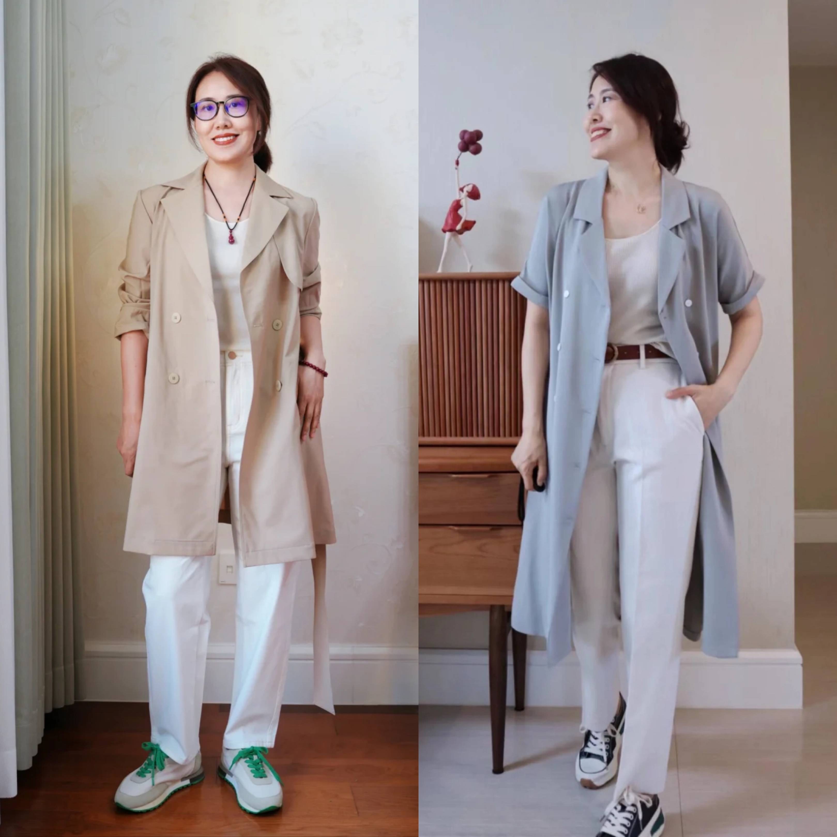 对于大龄女性来说,纯色单品远比花哨的衣服来的更加高级,比如搭配风衣的时候,内搭与裤子选择同色系,再套一件中长款的纯色风衣,就非常的显瘦又显高,尤其对于小个子身材来说,这种搭配组合可以很大的提升个人气场。