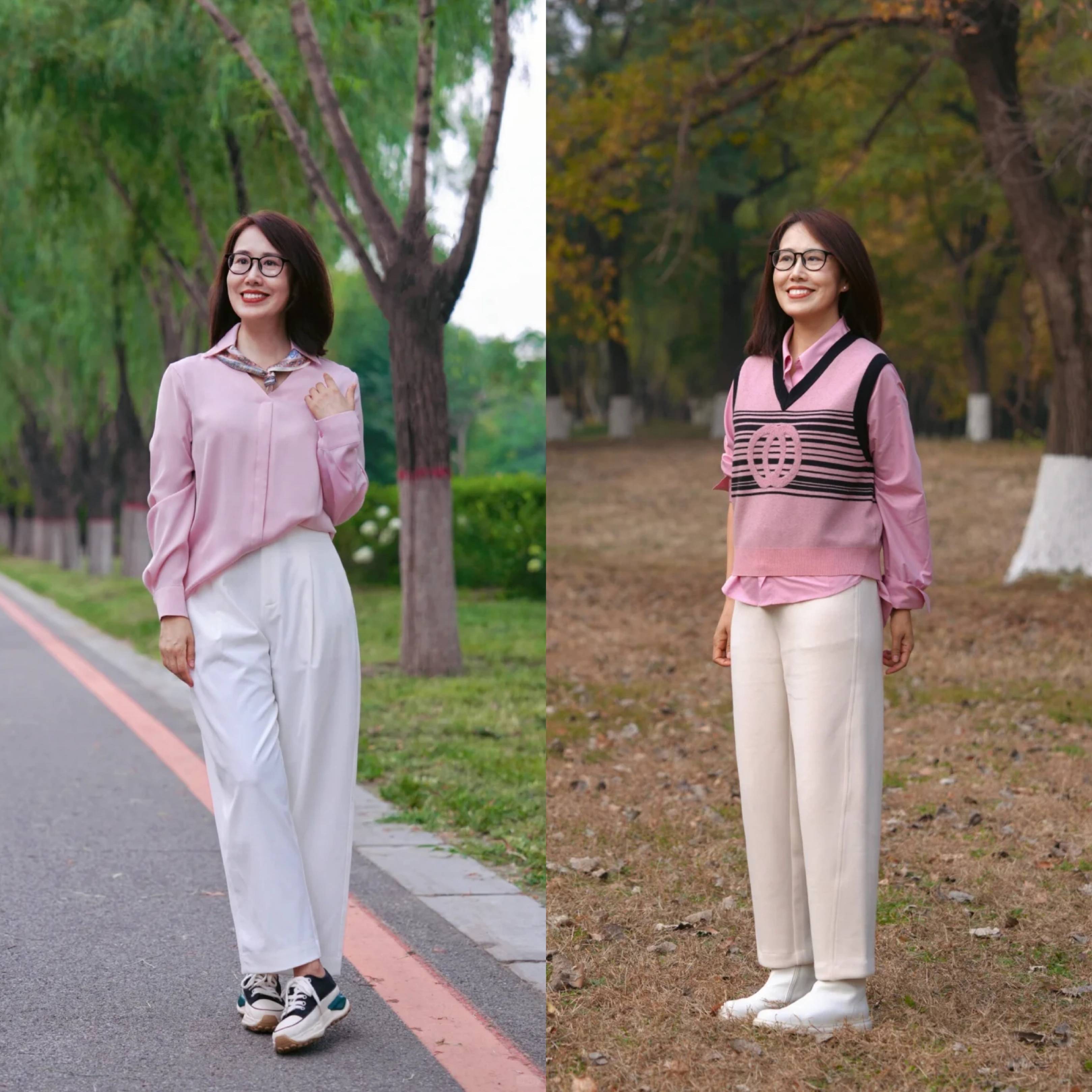 比如粉色+白色组合,很多人或许觉得粉色是小姑娘才穿的,50+的女性难以驾驭,其实只要色彩搭配得当,大龄女性也可以把粉色穿的很好看哦!比如博主的这两套搭配,淡粉色衬衫与白色高腰西裤的组合,以及淡粉色针织衫叠穿粉色衬衫,下半身衔接米色烟管裤,都是非常清新又舒适的早春穿搭。
