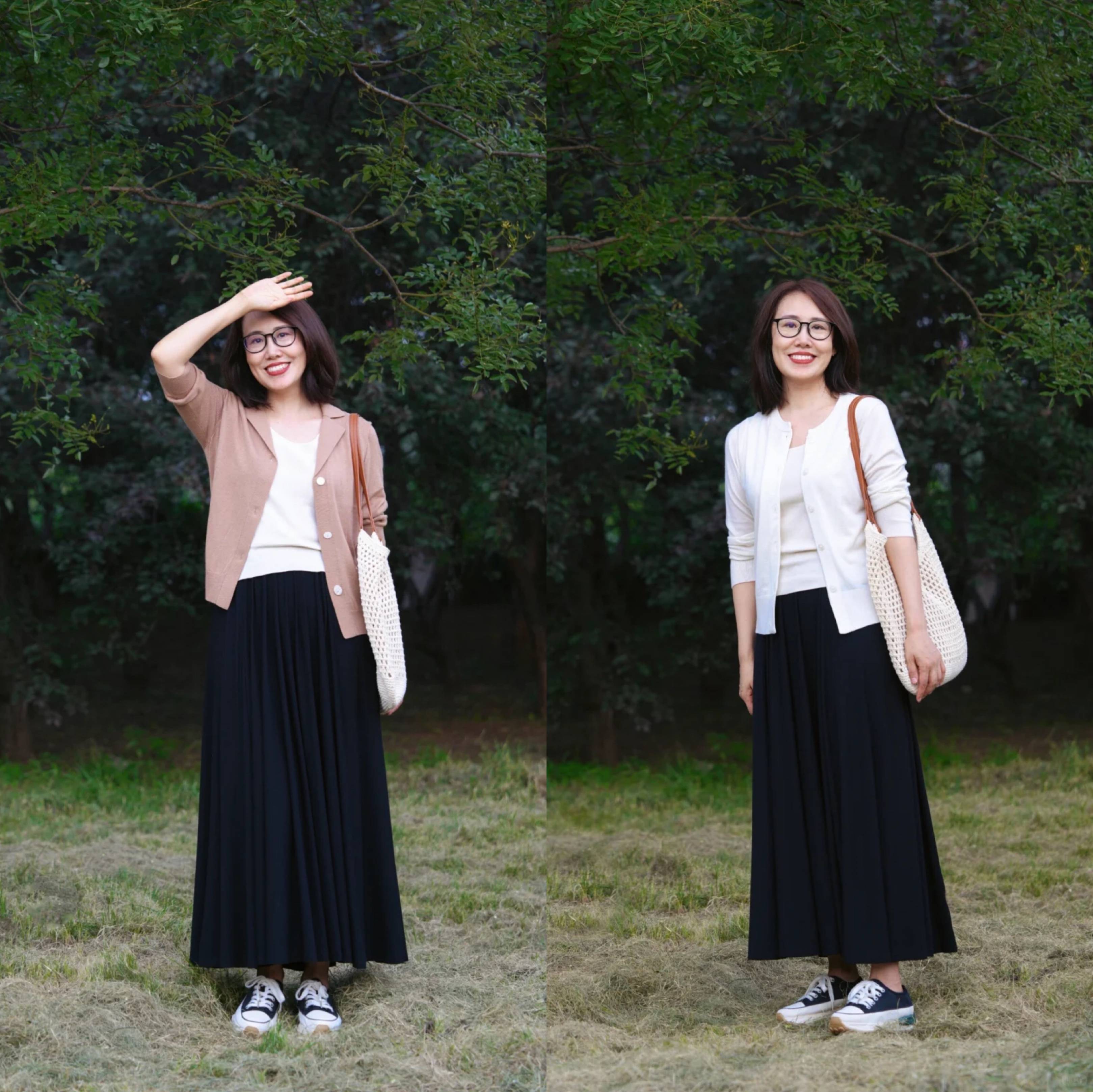 春季温柔风穿搭必备,选米白、燕麦色等浅色的纯色短款奶奶衫,凸显柔和感;搭配黑色高腰半身裙,“上浅下深”层次分明。可将内搭衣角微塞,凸显腰线。再搭一双浅口单鞋或者帆布鞋,尽显温婉优雅气质。