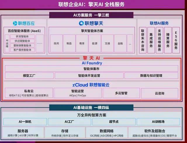 一擎:擎天AI 作为核心智能引擎,包含xCloud 联想智能云与AI Foundry两核心模块。xCloud 联想智能云提供私有云、智能运营、多云智管、云咨询等力。AI Foundry以模型工厂、智能体开发运营、数据与知识管理为核心,搭建智能体集市,实现模型与智能体的高效生产与复用。